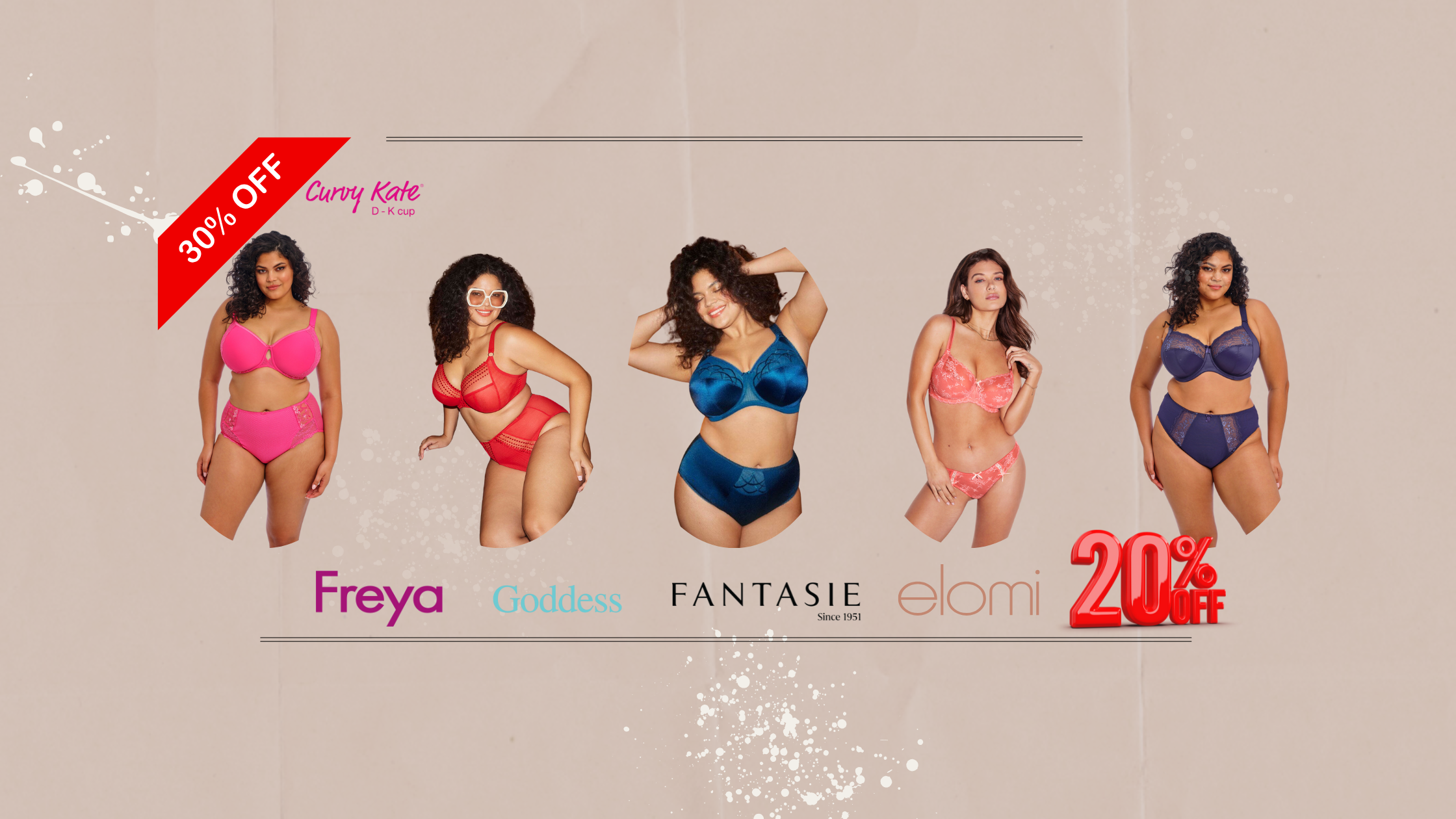 We handpick stunning lingerie and swimwear from world-renowned brands like Elomi, Freya, Curvy Kate, Goddess, and Fantasie — all in D to K cup sizes.